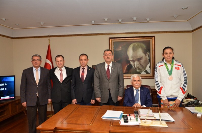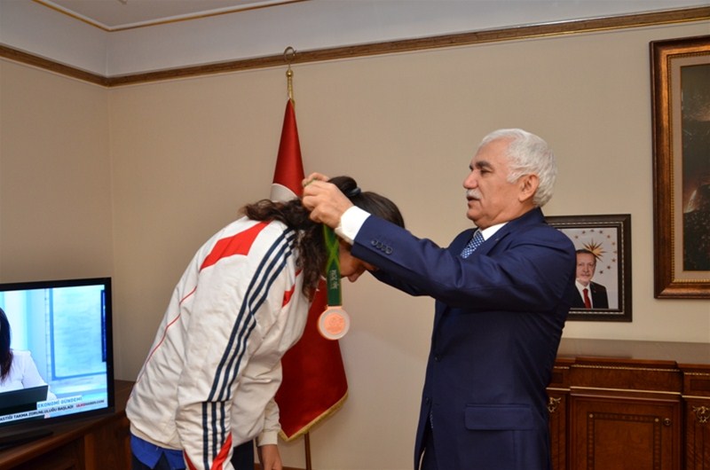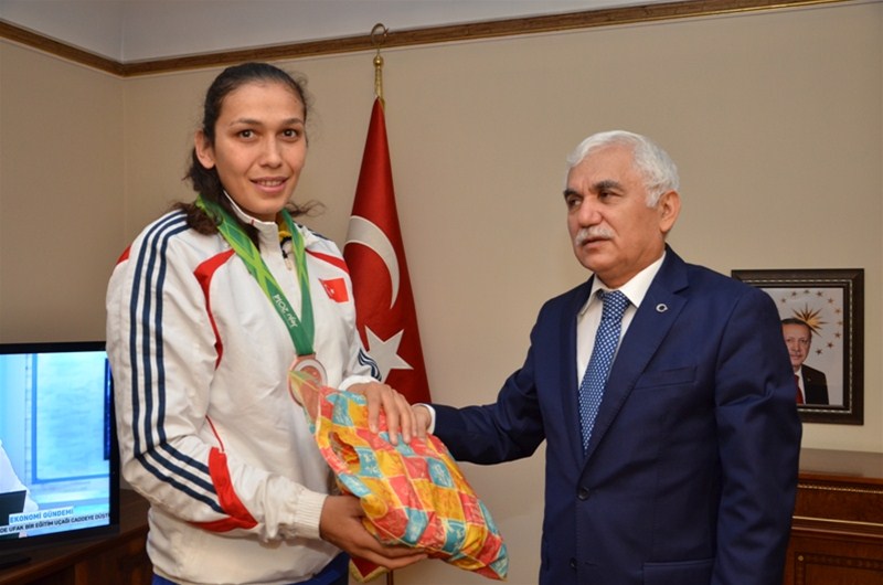 Güney Kore’nin Jeju adasında düzenlenen Dünya Kadınlar Boks Şampiyonası’nda üçüncü olarak bronz madalya kazanan Elif GÜNERİ'yi Vali Orhan Alimoğlu makamına kabul etti.