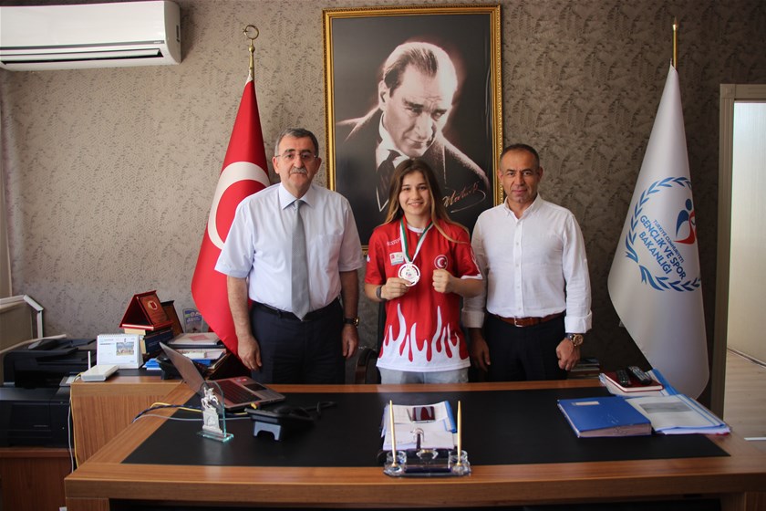 Bulgaristan’ın Sofia Kentinde 29 ülkeden 237 sporcunun katıldığı ve ülkemizi yıldızlarda 13, gençlerde 10 olmak toplam 23 sporcu ile temsil ettiği Yıldız ve Genç Bayanlar Kadınlar Avrupa Boks Şampiyonasında finalde Fransız Daria Benmessahel'e mağlup olup Avrupa İkincisi olarak Gümüş Madalya kazanan Milli Boksörümüz Çağla Aluç ve Boks Antrenörümüz Baykan ARSLAN , İl Müdürü Abdulkadir Çetin’e makamında ziyarette bulundular.